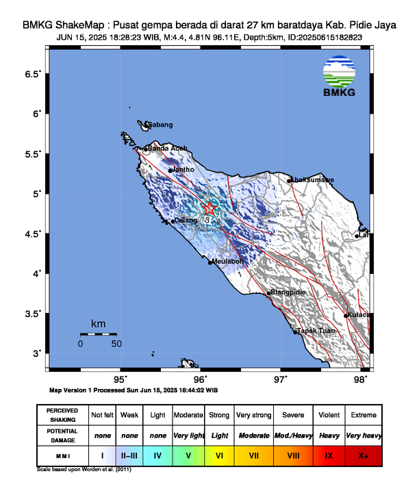 Kejadian dan Parameter Gempabumi: Hari Minggu, 15 Juni 2025 pukul 18:28:23 WIB, Kabupaten Pidie dan sekitarnya diguncang gempabumi tektonik. Hasil analisis BMKG menunjukkan bahwa gempabumi ini berkekuatan M4.4. Episenter gempabumi terletak pada koor... selengkapnya