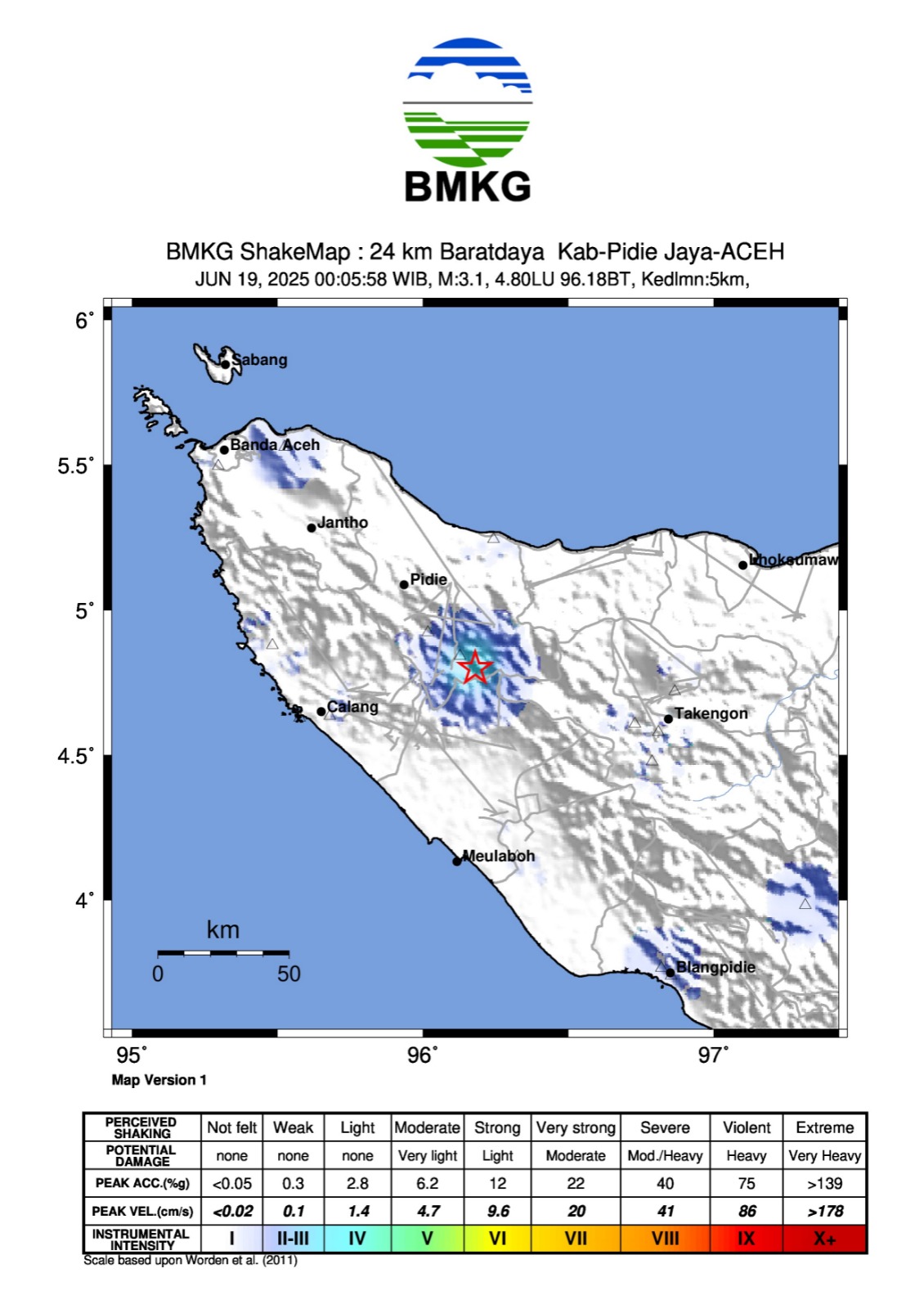 Kejadian dan Parameter Gempabumi: Hari Kamis, 19 Juni 2025 pukul 00:05:58 WIB, Kabupaten Pidie dan sekitarnya diguncang gempabumi tektonik. Hasil analisis BMKG menunjukkan bahwa gempabumi ini berkekuatan M3.1. Episenter gempabumi terletak pada koord... selengkapnya