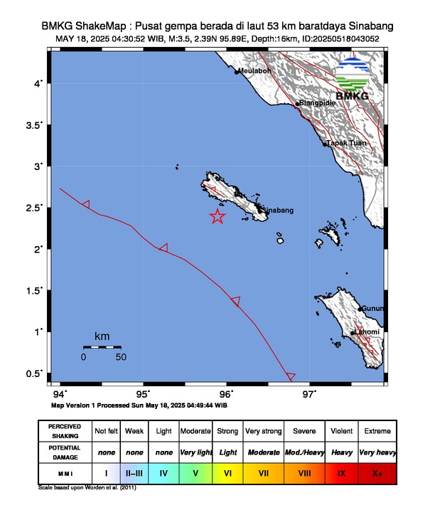 Kejadian dan Parameter Gempabumi: Hari Minggu, 18 Mei 2025 pukul 04:30:52 WIB, Kabupaten Simeulue dan sekitarnya diguncang gempabumi tektonik. Hasil analisis BMKG menunjukkan bahwa gempabumi ini berkekuatan M3.5. Episenter gempabumi terletak pada ko... selengkapnya