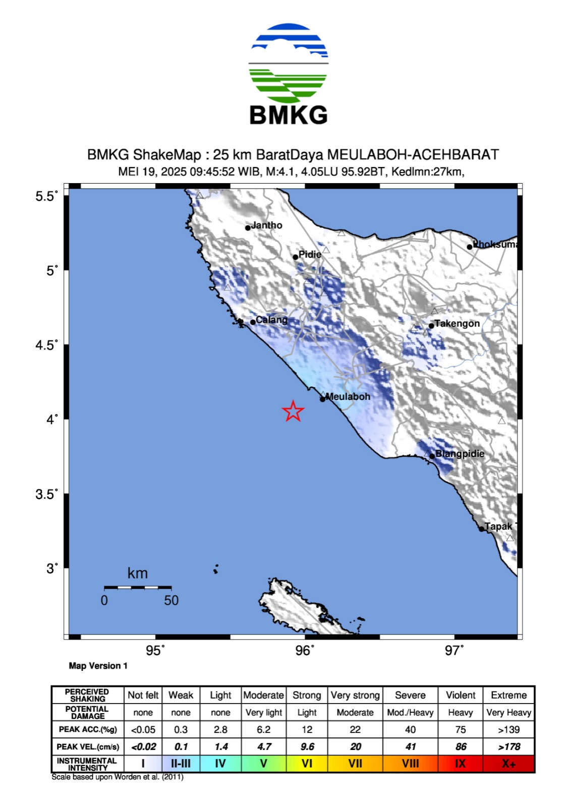 Kejadian dan Parameter Gempabumi: Hari Senin, 19 Mei 2025 pukul 09:45:52 WIB, Kabupaten Aceh Barat dan sekitarnya diguncang gempabumi tektonik. Hasil analisis BMKG menunjukkan bahwa gempabumi ini berkekuatan M4.1. Episenter gempabumi terletak pada k... selengkapnya